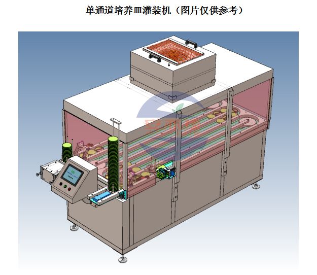 设备能够实现培养皿的自动开盖、自动灌装、线上冷却、培养皿信息标码、加盖码垛、整体包装等工序。