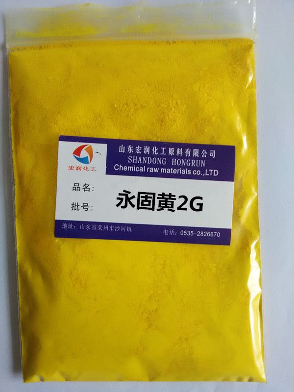 永固黄2G 一、技术参数 索引号:C.I.P.Y.17 耐光性:6-7级 耐热性:180-200℃。 耐酸性:5级。 耐碱性:5级。 耐水性:5级。 耐油性:5级。 PH值6-8级。 筛余物(60,80目):≤5.0。 吸油量(g/100g)≤55。 二、颜料性能 永固黄2G为绿相柠檬黄颜料,色泽鲜艳光亮,色光比联苯胺黄偏绿,着色力比永固黄2GS高,在油墨中具有优异的流动性和着色力。在塑料中有良好的耐迁移性。 三、主要用途 永固黄2G主要用于油墨、涂料色浆、塑料制品、橡胶、聚氨酯合成革、油漆、色母粒、玻璃纤维、美术颜料、文教用品等的着色。