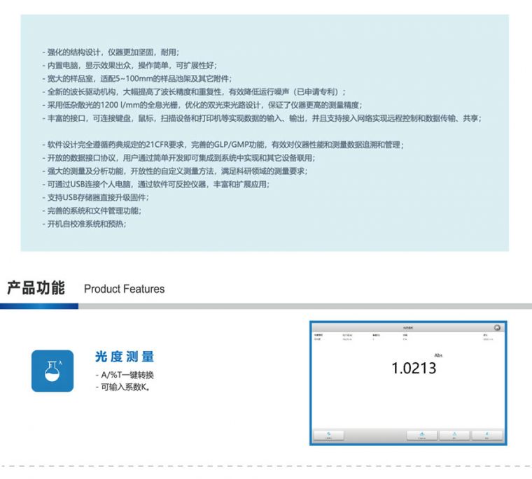 P9 双光束型紫外可见分光光度计。通过简单的参数设定,方便地进行光度分析、定量分析、动力学测试,配合专业的Mapada的扫描分析软件,可实现全波长光谱扫描、多波长测试、DNA/蛋白质分析。