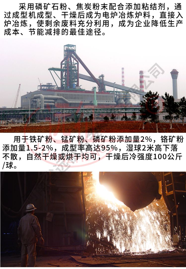创新的技术以达到节能减排:磷化工企业采用磷矿石、焦炭粉末配合添加粘结剂,通过成型机器成型,干燥之后成为电炉冶炼炉料,直接入炉冶炼,让剩余废料得到充分的利用,成为企业节能减排降本增效的途径。 适应性很强:由于多数磷化工企业的剩余废料磷矿粉、焦炭粉末露天堆放很久,湿度含水量很高,矿粉成型由此面临烘干的困难,采用该粘结剂却不需要烘干设备,添加之后成型便可使用。 成型率高、效果好:应用于磷矿粉一次成型,高到96%的成型率,球团耐高温,球团矿品味不降低 可观的经济效益:磷矿粉与磷矿石价格相差不小,用磷矿粉配制焦粉成含碳球团替代磷矿石和焦炭,成本大大降低,看得见的经济效益。