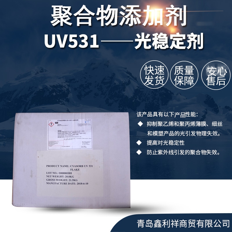 CYASORB UV531――(2-hydroxy-4-n-octoxy benzo-phenone)是相对不活泼的化合物,不会与常用的塑料添加剂反应。它通过择优吸收破坏性的高能紫外线辐射继而将其耗散为非破坏性能量来防止紫外线引发的聚合物失效。