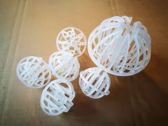 多面空心球 空心球填料厂家 空心球填料价格我厂生产的新型塔器填料主要有:多面空心球,阶梯环,鲍尔环,覆盖球,悬浮球,蜂窝斜管等系列产品。它广泛应用于电力、化工、石化、造纸、环保等行业的脱碳、脱气、脱碳酸、油水分离、海水淡化、纯水、废水处理等装置中。具有气速高、叶片多、阻力小、全湿比表面积大、耐高温、耐腐蚀、表面亲水性能好、最小喷淋密度低等优点。 多面空心球填料在球的中部沿整个周长有一道加固环,在环的上下各有十二片球瓣。上下球瓣互相交错,沿中心轴呈放射形布置。我厂在有关生产工程塑料的单位帮助下,总结经验,证实多面空心球填料具有如下优点:由于表面积大;传质效率高,产品的球瓣与球瓣之间空间大,且重量轻、强度大、安装方便、耐高温(在140℃的环境中不变形),因此它在废气净化、脱硫、脱二氧化碳气体、废水处理等行业中得到广泛应用。 技术参数