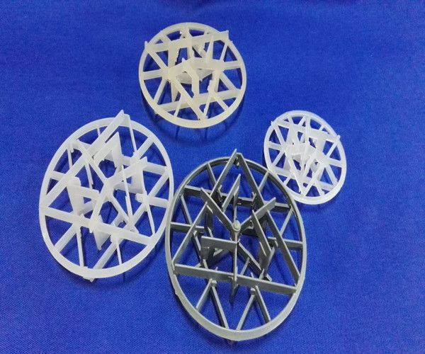 塑料雪花环具有空隙率大、耐热、耐化学腐蚀,压降和传质单元高度低,泛点高、汽液接触充分、比重小、传质效率高等特点。在各种介质中的使用温度为60-150摄氏度,广泛用于石油、化工、氯碱、煤气、环保等行业的填料塔中。
