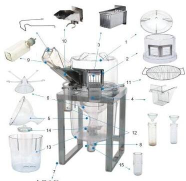 将下面的笼格附着在上面的笼格上,并用上面笼格的三个外形像槽口的三个肋骨排列在下面凹槽,使其上升并保证下面笼格安全地进行是顺时针转动。将收集管(15)插入下面笼格底板的中心孔洞中。将**个带漏斗的液体悼念管(12)插入下面笼格底板上的**个洞内。这样,你的笼具就完全装配好了。