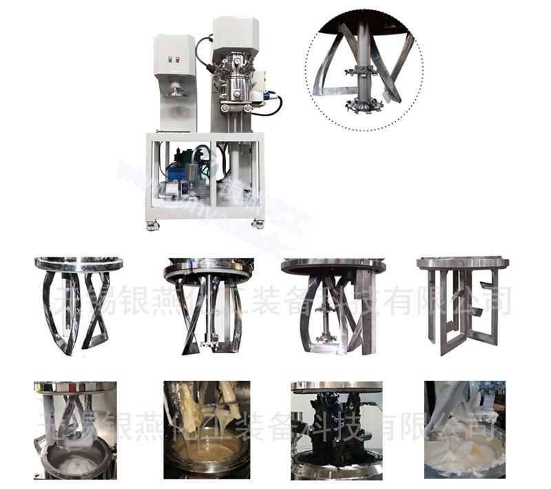 实验室行星搅拌机结构:实验室行星搅拌机设备一般由设备机架、升降结构、搅拌系统、真空系统、温控系统、控制系统(手动或者PLC控制)等组件构成;液压升降系统能保证设备运行稳定 实验室浆料搅拌机原理: 实验室双行星搅拌机根据行星运动轨迹设计,搅拌结构有低速搅拌器、高速搅拌器、以及相应的刮板装置组合而成。双行星搅拌机的双组低速搅拌器自转的同时绕着轴心进行公转,而且低速搅拌器的形式根据不同的物料粘度和生产工艺选择不同的搅拌形式,常见的搅拌形式包括桨叶式、麻花式、爪式、框式等结构,具备良好的混合、反应、捏合、溶解的作用;高速分散器由多层具备极高线速度的锯齿状分散盘组成,它同样在高速自转的同时绕着轴心进行公转,能够将粉料(助剂)快速的分散到浆料里,具备很强的分散作用;刮板装置根据客户实际的生产工况选配。双行星搅拌机搅拌运转过程中,确保搅拌均匀,无死角无残留,能实现物料在短时间内快速有效的混合均匀。
