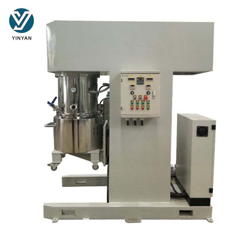双行星搅拌机工作原理: 双行星真空分散机工作过程中,两支平行的搅拌桨按设定的固定旋转比例运转,沿搅拌桶公转的同时亦快速自转,同时搅拌桶内有随公转同步运转的回旋刮板不停旋转,使物料由搅拌桶内壁移动到搅拌桨附近,搅拌器的运转方向与公转可同向亦可逆向,达到不同剪切目的。另两支单独动力装置的高速分散齿盘亦随公转一起沿搅拌桶内运转,进行高效分散,乳化,高速分散齿盘为变频调速,可根据生产工艺自定转速。 双行星分散机特点: 1、线速度高:线速度可达25m/s,分散时间大大缩短;搅拌完后的料颗粒度小、一致性高,有效解决浆料团聚现象。 2、轴承采用进口轴承,比传统深沟球轴承的径向和轴向负荷大,承载能力更高,能够承受更高转速而不变形,大大提高了搅拌转速以及使用寿命。 3、零对零装配理念:精密组装,零件配合度高,核心部件加工精度公差小,从而保证了同心度以及平面度,实现核心部件装配实现零对零。运行更加平稳,一米外噪音低于70db(A)。 4、密封性能高,无漏油漏气现象:两套机械密封加上软、硬等密封,行星传动箱采用全密封结构,轴承位经过全新设计,合理分布轴承限位,从而减小轴承的磨损;真空度空载24小时保压 -0.092以上,确保搅拌过程无漏油漏气现象。 5、桨与桶内壁间隙:桨与桨、桨与桶壁、桨与桶底之间间隙合理。