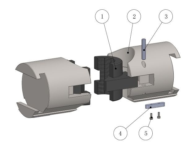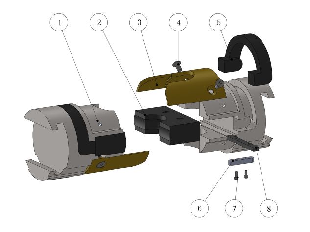 1.卡瓦体 2.闸板体 3.定位销 4.定位键 5.螺钉 | 1.闸板体 2.前部胶芯 3.导向叶片 4.螺钉 5.顶密封胶芯 6.定位键 7.螺钉8.导向键 |