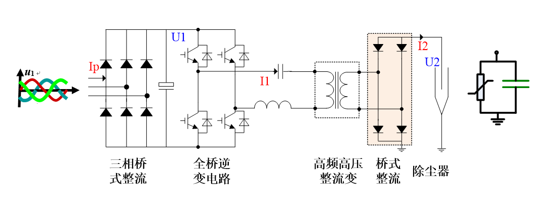 南环科技自主研发的HF系列电除尘器高频电源具有优异的节能减排特性,解决了传统工频电源除尘效率低和能耗偏高的问题,全面替代了常规工频电源,××了我国电除尘器高频电源的技术发展。 技术参数 ·输入电压:三相电压380V±10% ·输出电压:66kV、72kV、80kV ·输出电流:1000mA、1200mA、1400mA、1600mA、2000mA、2400mA ·工作频率:≥40 kHz ·转换效率:≥92% ·功率因数:≥0.92 ·重 量:600 kg ·适用温度:-30℃~55℃ ·体 积:1200 mm×1000 mm×1300mm 工作原理 HF系列电除尘器高频电源采用串联谐振电路设计,把三相交流电整流为直流电,通过逆变电路形成高频交流电,再经高频整流变压器升压整流后,输出高频脉动电流至电除尘器,其工作频率一般在20kHz~50kHz 。
