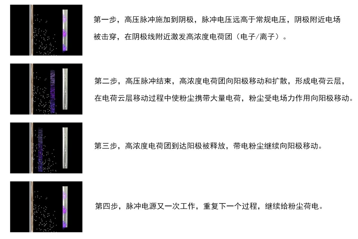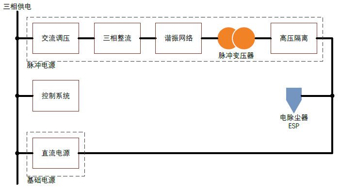 技术优势: 超高瞬时脉冲 脉冲电压可达140kV以上,脉冲电流峰值300A,瞬时功率达到30MW,脉冲宽度只有75μs,保证了电场瞬时超高的电荷浓度。 提高除尘效率,尤其适合于微细粉尘 脉冲电源激发的电荷浓度为常规直流电源的几百倍,极大提高了粉尘的荷电量,保证了PM2.5微细粉尘充分荷电,从而大幅提高除尘效率,工程应用表明可减少粉尘排放50%以上。 工况适应能力强,有效抑制反电晕 高比电阻粉尘在电场电流较大时,会导致电荷积累在粉尘层中,在粉尘层中形成较高的电压,产生反电晕。在脉冲电源供电情况下,因平均电流较小,减轻了粉尘层中的电荷积累,因而可减弱反电晕的发生。因此,煤种和粉尘的适用性大幅提高,对高比电阻粉尘(比电阻在1011~1015)等恶劣工况具有广泛的适应性。 大幅节约电能 脉冲电源采用间歇供电方式,其供电时间短且采用能量回馈机制。脉冲源负责粉尘荷电,而基础电源只需维持电除尘器电场起晕电压,提高了电能利用效率,在满足除尘效率的同时减少了供电功率。