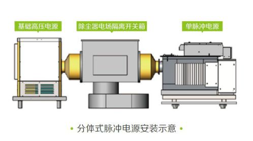 结构型式 HFPPS系列电除尘器脉冲电源提供一体式脉冲电源和分体式脉冲电源两种型式,用户可根据实际情况自由选择。 一体式脉冲电源 基础源和脉冲源置于同一机柜,利于保护电路和隔离电路设计,设备稳定性高。在现场安装过程中,只需直接替换原直流高压电源即可。 分体式脉冲电源 脉冲源设计为独立机柜,与高频电源、三相电源、工频电源叠加,实现复合电压输出。该方式下,用户可利用原电除尘器电场电源,减少成本费用。