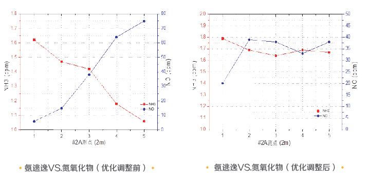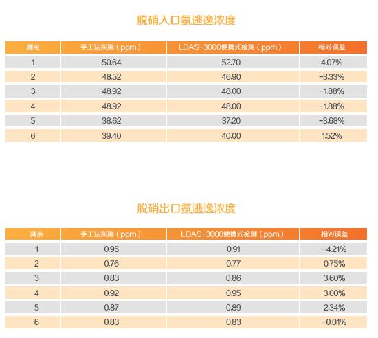典型案例二:氨逃逸场分布测试 为验证该产品对氨逃逸浓度测量的准确性,在某1000MW燃煤机组进行了手工法测量与仪器测量的对比试验。 通过对脱硝出口、入口氨浓度测试比对可以看出:无论氨浓度高还是低,手工法与仪器的测量结果偏差控制在±5%以内。