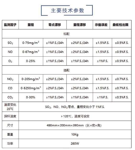 注:1、以上性能指标前提为环境温度、大气压、流量恒定; 2、S02、N0量程可定制,最大量程可至0-5000ppm、 0-1000ppm; 标准配置 ●主机(SO2、 NO、02) 用于监测废气中S02、NO和02浓度,双量程设计。 ●烟气预处理系统(探杆长度: 1. 5m) 用于对工况湿烟气进行滤尘、加热、冷凝脱水及自动排水处理。 ●微型热敏打印机 用于监测数据的打印。 可选配置 ●日主机(NO2、C0、C0) 除了S02、N0和02,NO2、 C0、CO2可选配。 ●定制型加热探杆 可根据客户需求,定制不同长度和加热温度的取样探杆。 ●氮氧化物转化器 NO2可以直接测量,或者通过氮氧化物转化器转化测量。 工程应用: