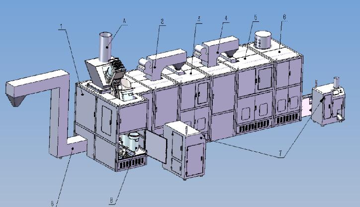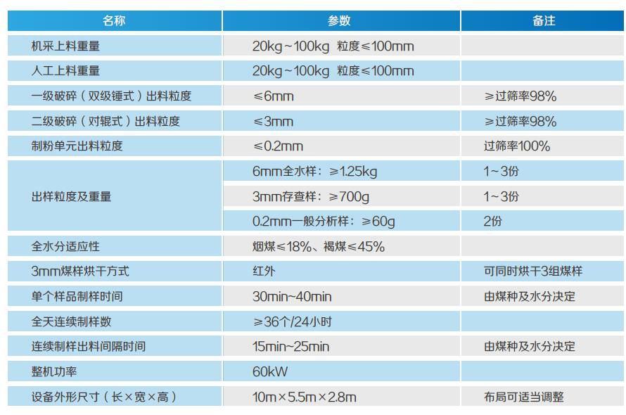 1-入料称重破碎单元 2-1#Z提 3-全水样单元 4-2#Z提 5-存查样单元 6-制粉单元 7-灌装单元 8-弃料单元 A-在线制样入料 B-离线制样入料 适用范围 主要适用于电力、煤炭、化工、环保等行业领域的煤样自动化制备工作。 技术参数