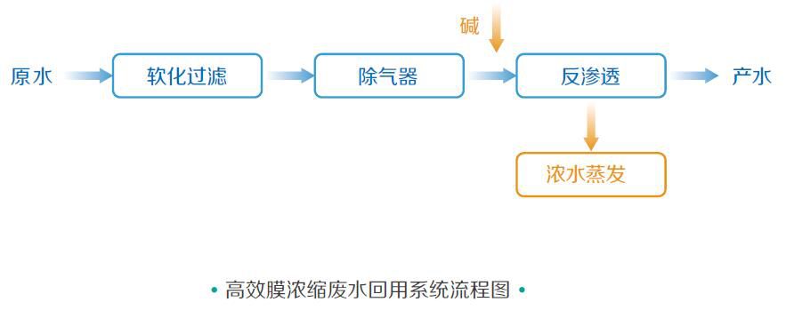 超滤反渗透系统,即双膜法,是废水回用于工业企业用户的最常用的处理工艺,但由于废水中含有成分复杂的污染物,如有机物、硬度、硅等,膜很容易产生结垢和污堵,导致系统回收率较低。反渗透连续在高pH条件下运行能够较好地解决上述问题,但对预处理要求非常高,高pH运行对氨氮去除率很低,运行成本也大幅度提升。 公司针对高pH运行的膜浓缩系统进行优化,开发了高效膜浓缩工艺,使RO在偏碱性条件下运行并定期进行高pH冲洗,将膜表面累积的有机物、胶体等去除。该系统既可克服常规反渗透的生物污染、有机物污染、无机物结垢和胶体污堵,又可克服在碱性条件下运行反渗透产生的消耗大量碱、而氨氮无法去除的缺点,同时,弱碱性运行下,反渗透对前处理(硬度、碱度去除)的要求降低,整个系统更易于操作更稳定。 系统流程 废水首先通过化学加药软化,之后进入离子交换除硬单元去除残留硬度,再通过除气器脱除二氧化碳。除气器出水进入反渗透浓缩单元,系统在碱性条件下运行,浓水侧TDS可浓缩到100000mg/L以上。