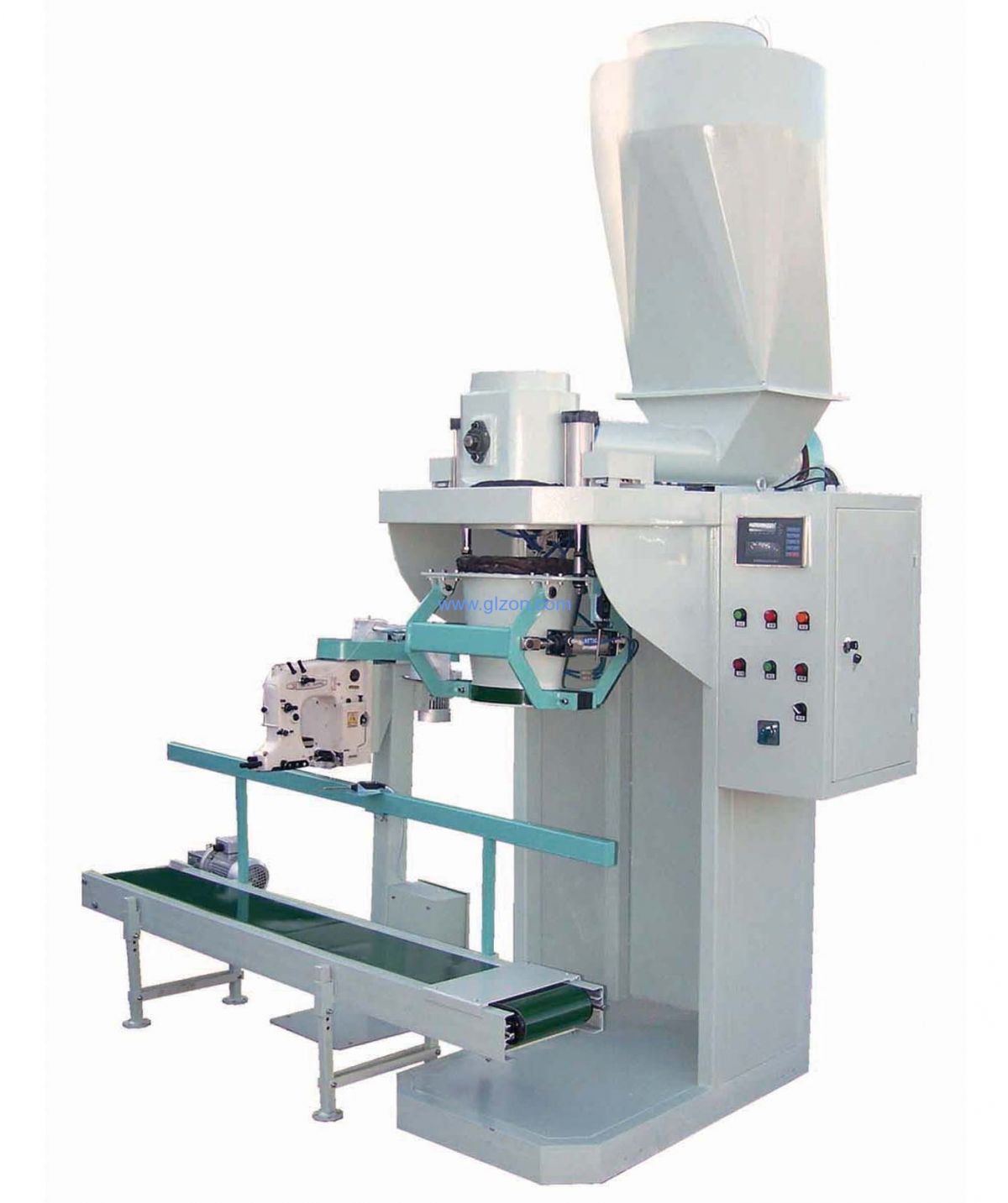粉料称重包装机是一种利用螺杆强制输送给料进行电子称重计量的包装设备,定量方式有净重和毛重二种;该设备由粗细螺杆来实现定量,细螺杆的驱动为变频电机,变频器的输入由称重传感器的重量信号来控制,加料可分二段或三段来控制;快加料时粗细螺杆一起按快速旋转进行送料,慢加料时由细螺杆慢速旋转进行精细加料,直至设定精度范围停止加料完成称重定量。