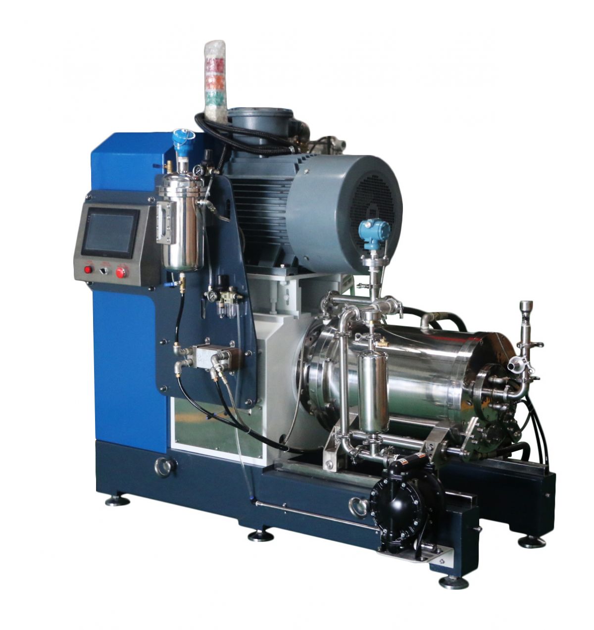 >> 净容量30L >> 分离器形式静态筛网 >> 分离器间隙0.2mm >> 冷却水流量约960L/H >> 冷却水温度8-12℃ >> 冷却水压力0.4mpa >> 冷却水进出水口>> ” >> 进料口压力表防爆型0-0.6mpa(可调节) >> 出料口温度表防爆型0-100℃(可调节) >> 研磨介质大小0.3-1.2mm(可选) >> 研磨介质重量75kg >> 外形尺寸1830×950×1850 >> 重量1800kg >> 颜色颜色以实际生产为准 进料形式 >> 物料泵浦型号1吋英格索兰气动隔膜泵浦 电器驱动部分 >> 电压380V-50Hz >> 主机功率45KW 4级防爆电机 >> 防爆等级IP55级 >> 主轴转速、线速度0~784rpm 12.96m/s >> 驱动皮带轮,线速度可通过皮带轮来调整 >> 轴承日本进口NSK >> 控制系统PLC自动控制 >> 保护装置接点式压力感应保护装置,桶内因阻塞等异常接点式压力感应保护装置,桶内因阻塞等异常状况下发生压力过高的情时,主机停机;如机械轴封或轴封片泄露,造成却吊桶内无冷却液,主机自动关机;循环压力感应保护,如机械轴封或冷却循环管阻塞,主机自动关机;温度感应保护,桶内温度过高,主机自动关机。 机械密封部分 >> 机械形式进口集成式双端面机械密封 >> 机密压力0.4mpa >> 机封密封圈O形圈防腐蚀的杜邦全氟密封圈 >> 机械密封圈材质氟胶加特氟龙(耐溶剂、耐腐蚀) >> 密封液添加与物料相溶密封冷却液 耐磨件配置 >> 内筒体材质碳化硅 >> 研磨转子材质ZrO2材质 >> 棒销ZrO2材质 >> 分离器材质耐磨不锈钢 对物料选材 >> 出料法兰316材质 >> 进出料连接管特氟龙(进口) >> 与物料管接出部分316材质 >> 气动泵聚炳烯(进口)