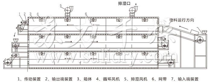 注:图中所示蒸发水量视物料干燥温度,铺料厚度及停留时间而定。
