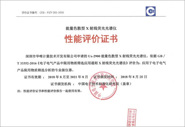 Ux-2900能量色散型X射线荧光光谱仪通过中国电子信息标准化研究院(国标起草和制定单位)的严格测评,获得GB/T33352-2016专业级证书。用于RoHS/ELV管控的有害元素铅(Pb),汞(Hg),镉(Cd),铬(Cr),溴(Br)和氯(Cl)的检测,在电子电器、汽车、医疗和包装等行业有着非常广泛的应用。
