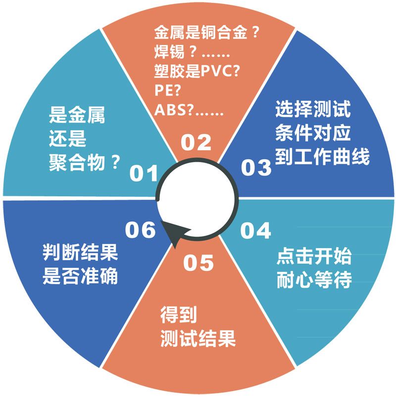 以往的测试(繁琐) 大多数测试样品,即使是专业人士也很难判断材质,一旦错误选择工作曲线,将产生极大的误差,得出错误的结论。 | 使用 UX- 2900(简单) 系统自动识别测试样品的材质,自动存入指定路径,测试结果准确无误自动选择对应的工作区,自动确定检测时间即使“新手”操作也能够得出正确的结果。