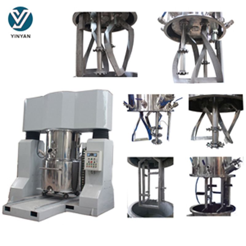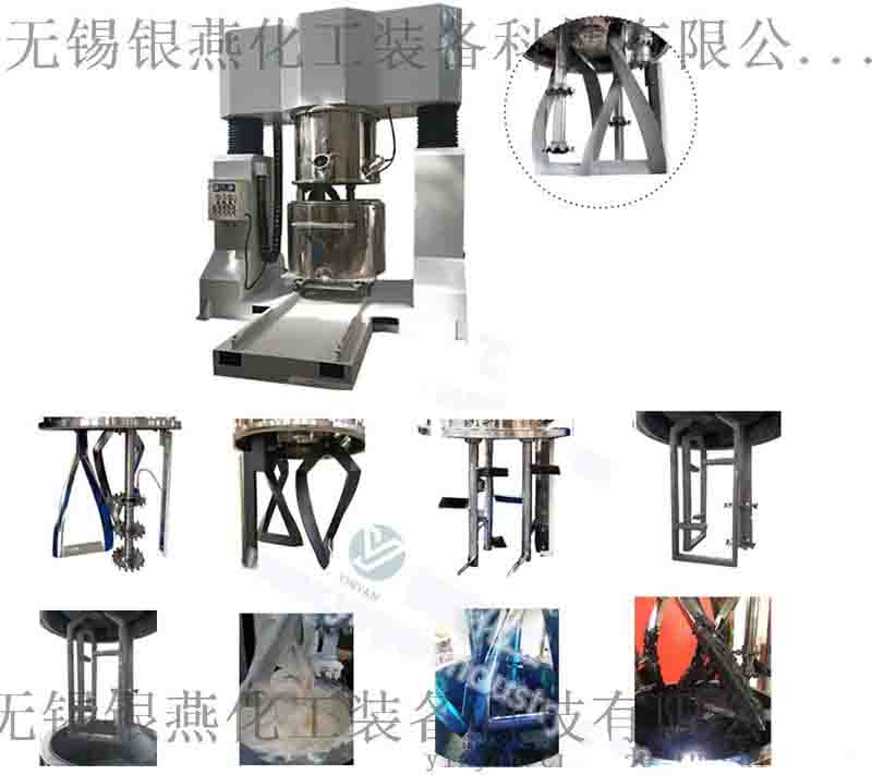 无锡银燕设计制造的双行星搅拌机由减速电机、行星架、搅拌器、刮壁器、料桶、液压升降系统、以及机架等构成。行星架转动时,带动箱内的搅拌轴、分散轴(选配)围绕料桶轴线公 转的同时高速自转,从而使物料受到强烈的剪切、捏合作用,达到充分分散和混合的目的;在行星架上有一刮壁刀随行星架转动,紧贴桶壁不断的刮拭,桶壁经大型 立车精加工后,再经大型自动抛光机抛光,以确保行星架上的活动刮刀在旋转时把桶壁的物料完全刮掉,使桶壁无滞留料,提高混合效果。是一款适用于高粘度物料的设备,该设备由低速搅拌器和高速 分散器组成,具有良好的混合、反应、分散、溶解作用,特别适用于固-液、液-液相的分散、混合;由于其极大的输出扭矩,特别适合粘度较大的产品,比如胶黏 剂、硅胶、锂电池浆料等;同时设备带刮壁刮底功能,无死角,无残留。 双行星混合机产品特点: 1.集反应、混合、混炼、分 散为一体的高效、多用途设备; 2.适用于各行业的他液-液、固-液、膏体-膏体、粉-膏体以及物料密度、比例悬殊大、从低黏度到高黏度(150万Cps)的生 产工艺中。 3. 刀在旋转时把桶壁的物料完全刮掉,使桶壁无滞留料,提高混合效果。 4由于其极大的输出扭矩,特别适合粘度较大的产品,比如胶黏 剂、硅胶、锂电池浆料等