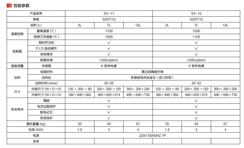 SX 系列专业型马弗炉包括了SX-11 系列/1100℃和SX-12 系列/1200℃两个系列,产品采用进口电炉丝、氧化铝陶瓷纤维保温材料,结合客户的广泛需求和现代设计理念,提供高效可靠的热处理解决方案,产品满足工矿企业、科研院校的实验室作为化学元素分析和小型钢件的淬火、退火、回火等高温热处理;还可作为金属、石器、陶瓷的烧结、灰分分析等试验前处理; 技术优势 ■ 性能特点: - 结构设计、安全性测试结果均符合国际电气安全标准; - 微电脑P.I.D 温度控制器,控温精确可靠,内置超温保护/ 报警功能; - 仪表自动校准功能,能够适应各种实验室环境; - 可编程程序控制器,能够实现自预热到恒温的阶梯式升温控制,确保试验温度控制稳定性; - 进口电炉丝材料,耐老化程度更高,相较于传统电炉丝寿命更长; - 氧化铝陶瓷纤维炉膛能够耐受一般的物质腐蚀,确保炉膛经久耐用; - 产品配置烟囱,通过炉门进气,一方面使得燃烧更充分,一方面能够及时排出烟雾挥发物; ■ 操作简便 - 产品外箱采用压花不锈钢(SUS304)材料制作, 美观易清洁; - 炉膛采用氧化铝陶瓷纤维材料,质地轻,整机重量比传统马弗炉重量轻; - 简洁的控制器面板,用户可根据预设程序一键启动; - 控制系统可根据客户需要进行预约开启和定时关闭功能; - 轻便的炉门设计,打开和关闭操作安全、简便; - 可存储7 组不同的常用温度程序,可随时调用; ■ 安全特点 - 箱体后部配有低噪音散热风机,调节箱体外表温度; - 设有过流、过热、过载等安全保护措施,确保电炉安全使用; - 具有过温保护器,门开关控制器,箱体表面冷却风扇和电阻炉异常报警功能,保证电阻炉安全运行不发生意外。