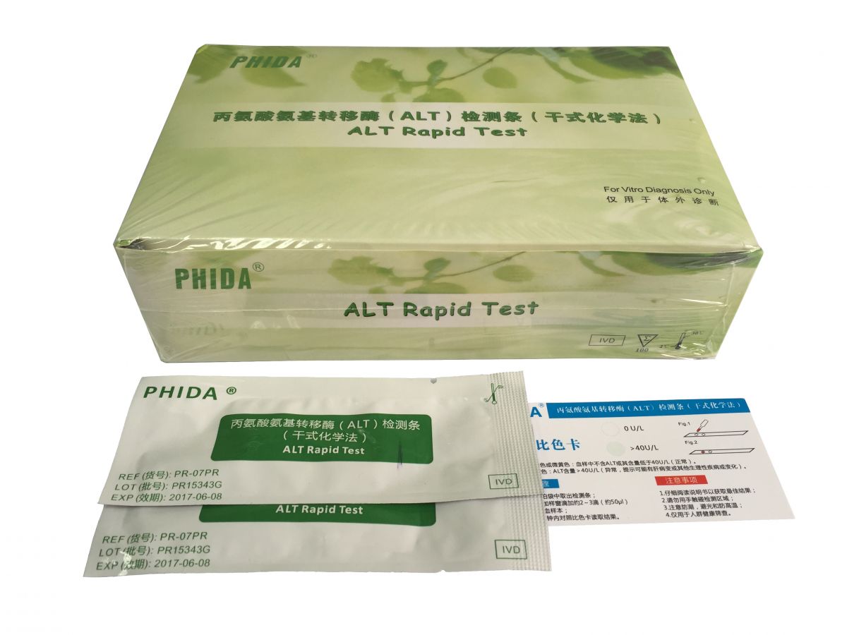 中文名称 丙氨酸氨基转移酶(ALT)检测条(干式化学法) 英文名称 ALT Rapid Test 包装规格 100人份/盒 预期用途 用于定性检测人全血中的丙氨酸氨基转移酶 丙氨酸氨基转移酶(ALT)检测条(干式化学法)特征及优势 √一步法,15分钟出结果 √与其他方法相关性极好,操作简便快捷 √准确度高,高灵敏度和高特异性 √适用于大批量体检或床边检测 √肉眼观察,无需温育和其他仪器测定 背景知识 ALT是一种存在于很多组织中的有关氨基酸的代谢酶,主要来源于肝脏,存在于肝细胞浆中,因肝内该酶活性较血清高很多倍,故只要有1%干细胞坏死,即可使血清中的ALT增加一倍,因此它是最敏感的肝功能检测指标之一。ALT的异常增高提示肝脏疾病、心梗、肌营养不良以及内脏的损害。血中ALT活性增高是肝实质损坏的特异性指标。 |