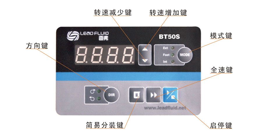 BT50S调速型蠕动泵流量范围0.0001~190毫升/分钟;工作转速0.1-50转/分钟;具有正反,启停,全速(清洗),调速等基本功能外,另外还可通过“简易分装键”实现重复定量输送液体的功能。在RS485通讯中,因为采用了MODBUS协议,更易于与其他控制设备如计算机,人机界面,PLC等连接。 · 4位LED数码管显示转速和工作模式; · LF-LED-OS软件系统; · LED指示灯显示内控、外控、脚踏开关等工作状态; · 面膜按键操作; · 具有启停、正反、全速,调速、状态记忆(掉电记忆)等功能; · 简易分装控制,实现重复传输定量液体的功能; · 转速分辨率0.1转/分钟; · 可以安装不同泵头,实现不同泵头与驱动器组合; · 电路板加喷三防漆工艺,达到防尘防潮效果; · 超强的抗干扰特性,宽电压设计,适用于复杂的供电环境; · 高低电平控制启停,正反,简易分装,光耦隔离,5V、12V、24V电平输入可选; · RS485通讯,支持MODBUS协议,方便与各种控制设备连接; · BT50S调速型蠕动泵可实现外部脚踏开关控制起停,实现简易分配灌装功能 操作界面展示