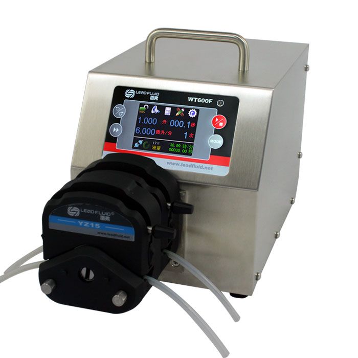 WT600F分配智能型蠕动泵采用彩色液晶显示,触摸屏操作,直观便捷;无刷伺服电机驱动,扭矩强劲,免维护;四种工作模式:流量模式,液量分配,时间分配,复制分配,适应不同工作要求;标准通讯协议,控制更方便;智能温控风扇,减少噪音;不锈钢外壳,易清洗,耐腐蚀。 · 真彩色液晶屏显示,触摸屏按键操作; · 流量模式,液量分配,时间分配,复制分配四种模式可供选择; · 三种分配模式可预存五组分配参数; · 启停、正反、全速、调速、状态记忆等功能; · 流量显示,流量控制,流量累计; · 转速分辨率0.1转/分; · 无刷伺服电机驱动,扭矩大,效率高,免维护; · 向导式流量校正功能; · 红外遥控功能; · 蠕动泵专家系统,向导提示操作,更加便捷; · 智能温控风扇,最大限度降低噪音; · 外控信号控制启停,正反,时间分装,光耦隔离,外控模拟量调节转速; · RS485通讯,支持MODBUS协议,方便与各种控制设备连接; · 电路板加喷三防漆工艺,达到防尘防潮效果; · 超强的抗干扰特性,宽电压设计,适用于复杂的供电环境; · 外壳采用304不锈钢,易清洗,有效防止各种酸碱盐和有机溶剂的腐蚀; · 大扭矩输出,可安装多个泵头,实现不同泵头与驱动器组合; · 可选配脚踏开关,实现分配灌装功能