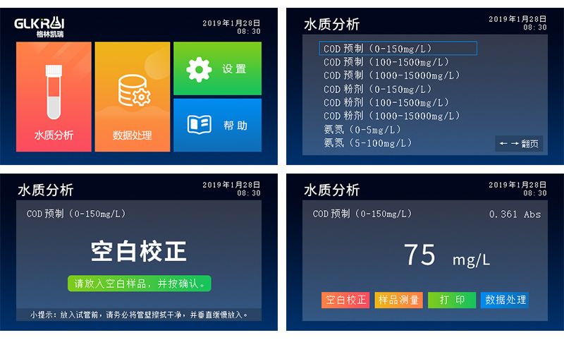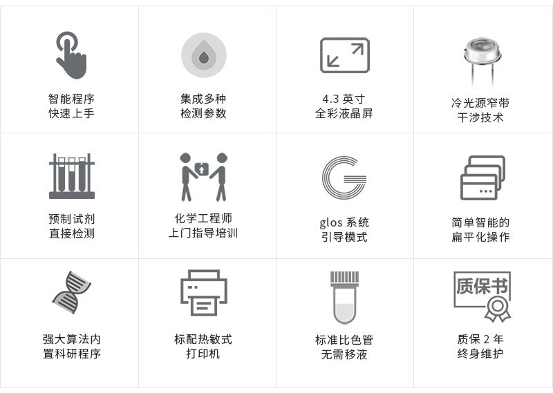 G21 氨氮快速测定仪,是一款具有高性价比的水质检测设备,使用比色法测量,先进的固态冷光源、窄带干涉技术及微电脑自动处理数据,直接显示及打印样品的浓度值。 设备搭载4.3英寸液晶屏,采用扁平UI设计的界面,可以让检测数据更直观的展现,引导式检测模式,降低了学习成本,使用者可以简单快速的测定污染物氨氮值。 应用领域 可广泛应用于科研院所、污水工程、水环境检测、石油化工、冶金钢铁、生物医药、食品乳业、毛纺印染、电子机械、水产养殖、光伏、皮革、造纸、等领域的水质检测。 检测原理 氨氮的测定采用纳氏试剂比色法,选定水质检测项目,进口冷光源发射出光源信号至传感器,经RAM处理器进行数据的运算处理,直接反馈出样品浓度值,以单位mg/L显示。 产品特点氨氮的测定执行国家环境标准HJ535-2009,测定结果准确有效。 进口固态冷光源,光学性能稳定,无需光源预热,光源寿命长达10年。 检测样品多,可开启连续检测模式,具备更高的检测效率。 搭载Glos水质智能检测系统、每秒几十次的数据均化计算。 技术参数