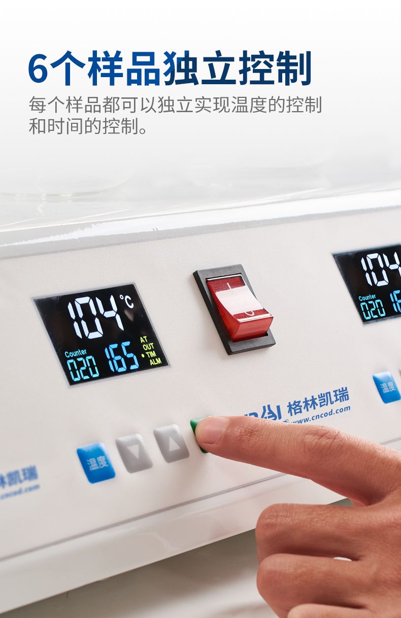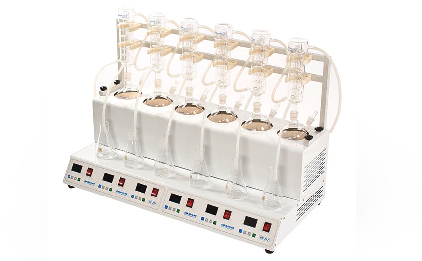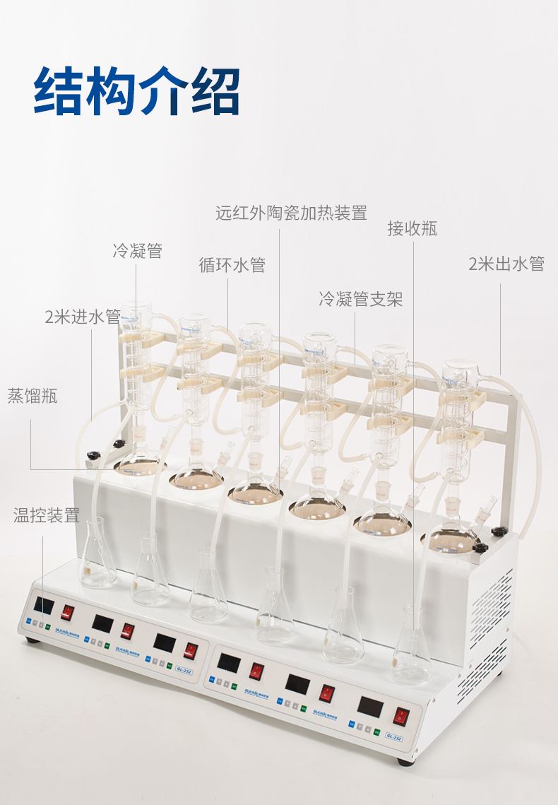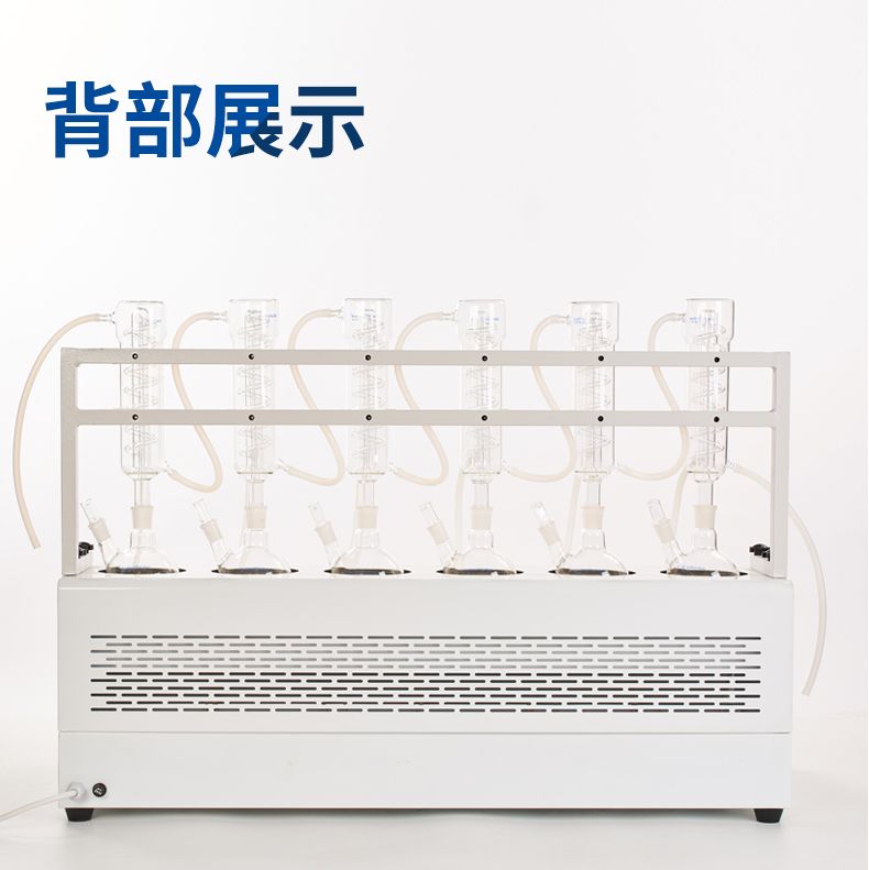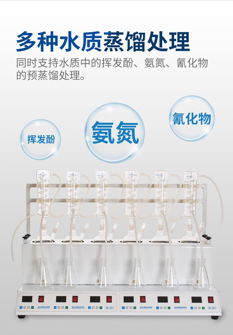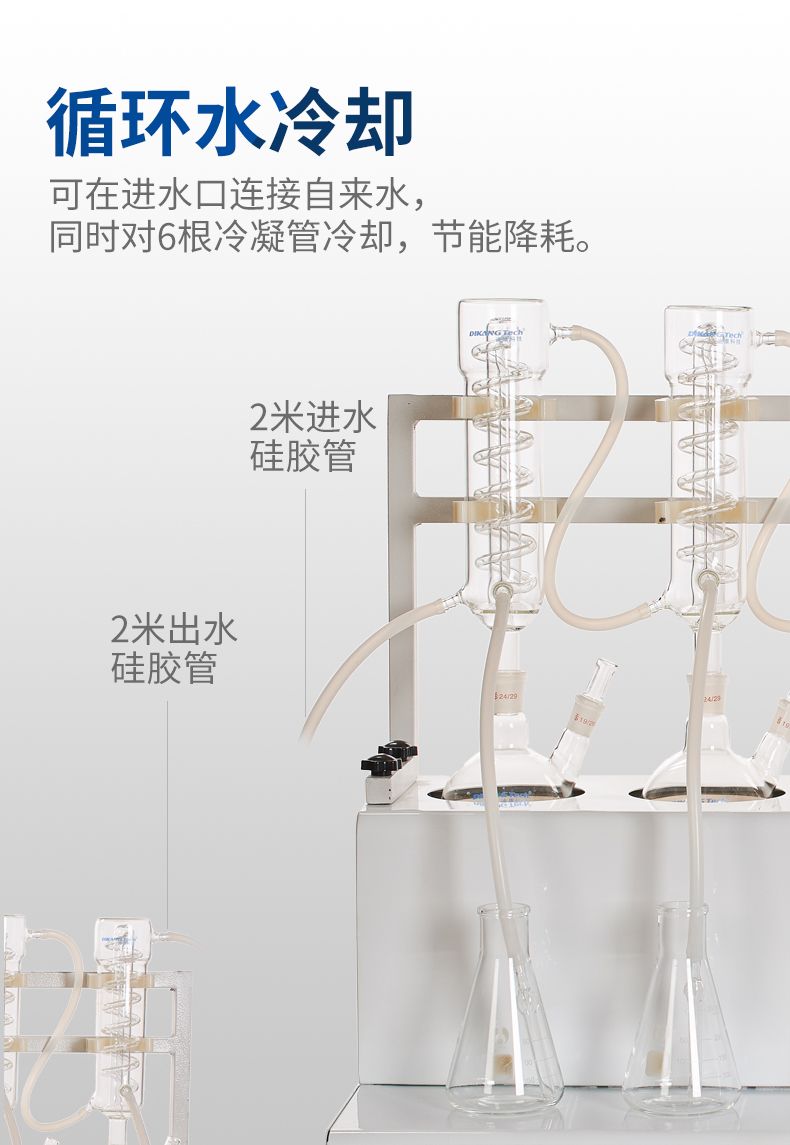 一、产品概述 多功能蒸馏仪产品采用一体化设计,同时采用智能控温、智能数字定时、自来水循环冷却等技术手段,实现了美观实用、节能环保等目的,可广泛适用于检测领域,如挥发酚、氰化物、氨氮、凯氏氮、油中水份等项目的蒸馏处理。 二、主要性能 一体式设计,安装维护方便。 可选配外置冷却水循环装置,同时对6根冷凝管冷却,节能降耗。 采用远红外陶瓷加热装置代替普通电热炉或电热套, 更节能,防水效果好耐酸碱腐蚀。 独立控制,一次可做6组样品,可单孔单控温。 具有加热定时功能,加热时间可调。 具有热效率高、寿命长、起温和降温速度快、加热时间和加热功率可调等优点。 具备防倒吸功能 。 特殊订制专用冷凝管,双层真空腔设计,蒸馏速度快不回流。 三、主要指标