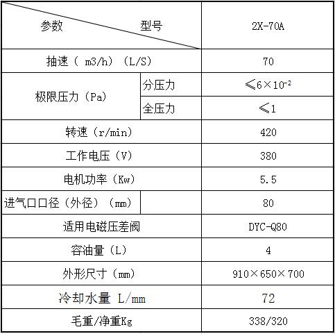 2X-70A皮带泵可直接从大气起动抽气,它可单独使用,也可作为增压泵、罗茨泵、气体循环冷却罗茨泵、油扩散泵、分子泵的前级泵、维持泵、钛泵的预抽泵。可供真空镀膜、真空热处理、真空冶炼、电子管、灯泡、化工、包装、吸塑成形、光伏、工矿企业的蒸馏、干燥、冷冻、过滤、理化等真空作业中。 2X-70A皮带泵特点 1、工作要求:进口压强在大于6500Pa时连续工作时间,不得超过3分钟以免喷油引起泵损。 2、工作要求:进口压强在小于1330Pa的条件下,允许长时期连续工作。 3、环境温度:真空泵一般在5℃-40℃的室温及不高于90%的相对温度的环境内使用。 4、气体类型:常温无其它混合物的清洁干燥空气,不许有含其它粉尘及水分。 5、设有气镇阀,可抽除少量水蒸汽,延长泵油使用时间(除2X-4A外)。 6、可单独作中真空泵用,也可与其它高真空泵组合作前级泵用。 二、技术参数
