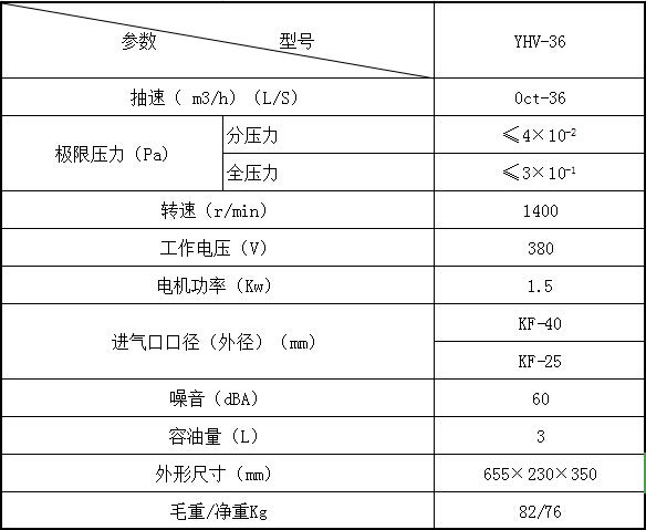 YHV-36型最新旋片式真空泵是一种油封式、双级、直联、风冷旋片式真空泵。 特点: 1、它可以单独使用,也可以作为其它高真空泵或超高真空泵的前级泵; 2、配制特殊设计气镇阀,防止泵油混水,延长泵油的使用时间; 3、抽气效率高、极限真空高、使用寿命长; 4、设有自动防返油止回阀,永不返油;当停泵后,防返油阀会自动封闭进气口,对被抽容器保压(10-100Pa)的作用; 5、专配真空干燥箱、冻干机、印刷机械、镀膜机、手套箱、冰箱流水线; 6、可配小口径转换接头、KF接口、法兰接口; 7、当抽吸含有蒸气、颗粒、腐蚀性气体,在泵的进气口须安装辅助设备,如冷凝器、除尘器等。 二、技术参数