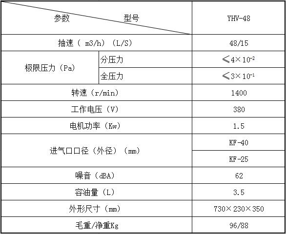 YHV-48型最新旋片式真空泵是一种油封式、双级、直联、风冷旋片式真空泵。 特点: 1、它可以单独使用,也可以作为其它高真空泵或超高真空泵的前级泵; 2、配制特殊设计气镇阀,防止泵油混水,延长泵油的使用时间; 3、抽气效率高、极限真空高、使用寿命长; 4、设有自动防返油止回阀,永不返油;当停泵后,防返油阀会自动封闭进气口,对被抽容器保压(10-100Pa)的作用; 5、专配真空干燥箱、冻干机、印刷机械、镀膜机、手套箱、冰箱流水线; 6、可配小口径转换接头、KF接口、法兰接口; 7、当抽吸含有蒸气、颗粒、腐蚀性气体,在泵的进气口须安装辅助设备,如冷凝器、除尘器等。 二、技术参数