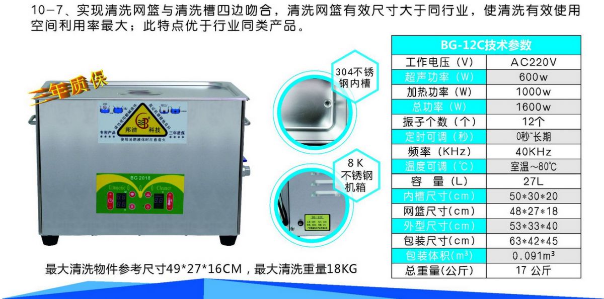 产品名称:BG-12C超声波清洗机产品描述: 型号:新款数显BG-12C 超声功率:600W 振子个数:12个 容量:27L 定时:数显可调 温度:室温~80℃数显可调 频率:40KHz 内槽尺寸:50*30*15cm 工作网篮尺寸:48*27*18 外型尺寸:新款53*33*40cm 纸箱包装尺寸:新款63*42*45 排水管尺寸:直径2cm*长100cm 内槽材料:进口304不锈钢(NSF认证) 外箱材料:国产8K镜面不锈钢 重量:新款17公斤