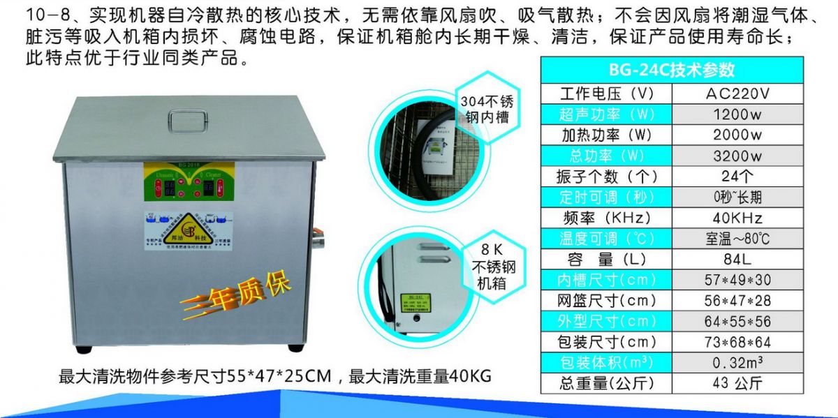 产品名称:BG-24C超声波清洗机产品描述: 型号:数显BG-24C 超声功率:1200W 振子个数:24个 容量:84L 定时:数显可调 温度:室温~80℃数显可调 频率:40KHz 内槽尺寸:57*49*30cm 工作网篮尺寸:56*47*28cm 外型尺寸:64*55*56cm 纸箱包装尺寸73*68*64cm 排水管尺寸:直径3.3cm*长130cm 内槽材料:进口304不锈钢(NSF认证) 外箱材料:国产8K镜面不锈钢 重量:43公斤