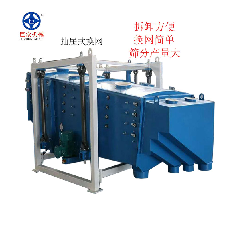 方形摇摆筛工作原理:筛机启动后,筛机揺动体即筛箱在惯性力的作用下作前后往复运动,筛箱带动筛面作周期性摇动,从而使筛面上的物料随箱一同作定向跳跃式运动,期间,小于筛面孔径的物料通过筛孔落到下层,成为筛下物,大于筛面孔径的物料经连续翻滚跳跃运动后从排料口排出,完成筛分工作。