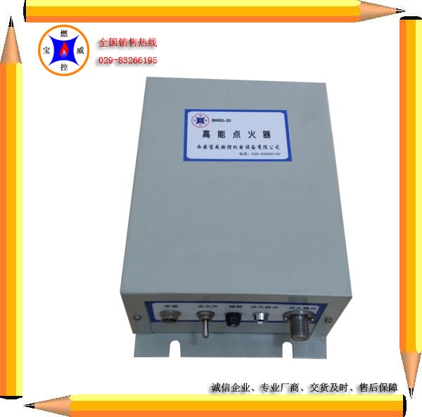 一、锅炉点火装置技术参数: 1、电源电压:220V±10% 50/60HZ2、适应燃料:轻油、重油、低热值燃气3、点火杆耐温:1300℃4、点火频率:6-12次/S5、火花能量:20J 二、点火器壳体: 1、材料 金属机箱2、体积 适合于单独使用或者装控制箱,设计两种尺寸 长×宽×高=400×225×125mm长×宽×高=280×190×115mm三、点火杆及点火电缆 1、点火杆前端材料2520高温合金;semicond高温材料2、常规点火杆外径Φ16,安装螺纹M18×1.5,特殊情况点火杆外径,长度,连接方式,可根据用户要求定做。3、点火电缆为专用高能电缆,长度根据用户要求供应锅炉点火装置。