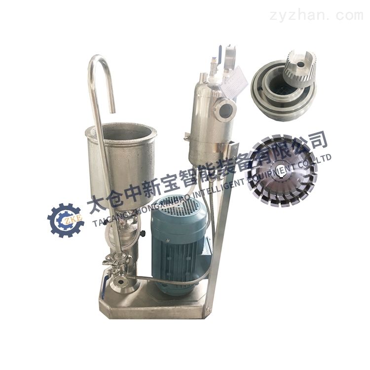 高剪切均质研磨分散机,在线式高剪切研磨分散机,管线式研磨分散机 ZKE/中新宝高剪切均质研磨分散机是由电动机通过皮带传动带动转齿(或称为转子)与相配的定齿(或称为定子)作相对的高速旋转,被加工物料通过本身的重量或外部压力(可由泵产生)加压产生向下的螺旋冲击力,透过研磨机定、转齿之间的间隙(间隙可调)时受到强大的剪切力、摩擦力、高频振动等物理作用,使物料被有效地乳化、分散和粉碎,达到物料超细粉碎及乳化的效果。此款高剪切研磨机比普通的高剪切研磨机的速度达到4-5倍以上,分散乳化均质研磨效果非常好。 21000转高剪切研磨分散机,高剪切的细化作用一般来说要弱于均质机,但它对物料的适应能力较强(如高粘度、大颗粒),所以在很多场合下,它用于均质机的前道或者用于高粘度的场合。在固态物质较多时也常常使用胶体磨进行细化。
