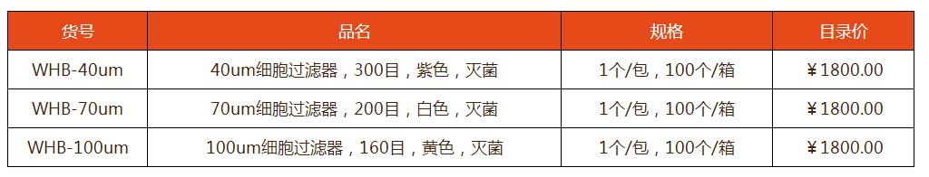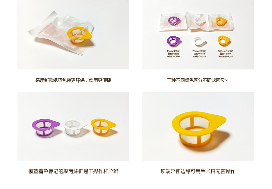 特点 WHB细胞过滤器经过伽马射线灭菌,过滤快速,使用简便,用于从组织中分离原代细胞,持续获得形状性能一致的单细胞悬液。常用于器官培养、组织转运或移植,尤其适用于干细胞和原代细胞过滤,常与流式细胞仪配套使用,是流式细胞分选实验较佳选择。WHB细胞过滤器使用坚固的尼龙网制作,常用三种规格可选:100um(黄色),70um(白色),40um(紫色)。