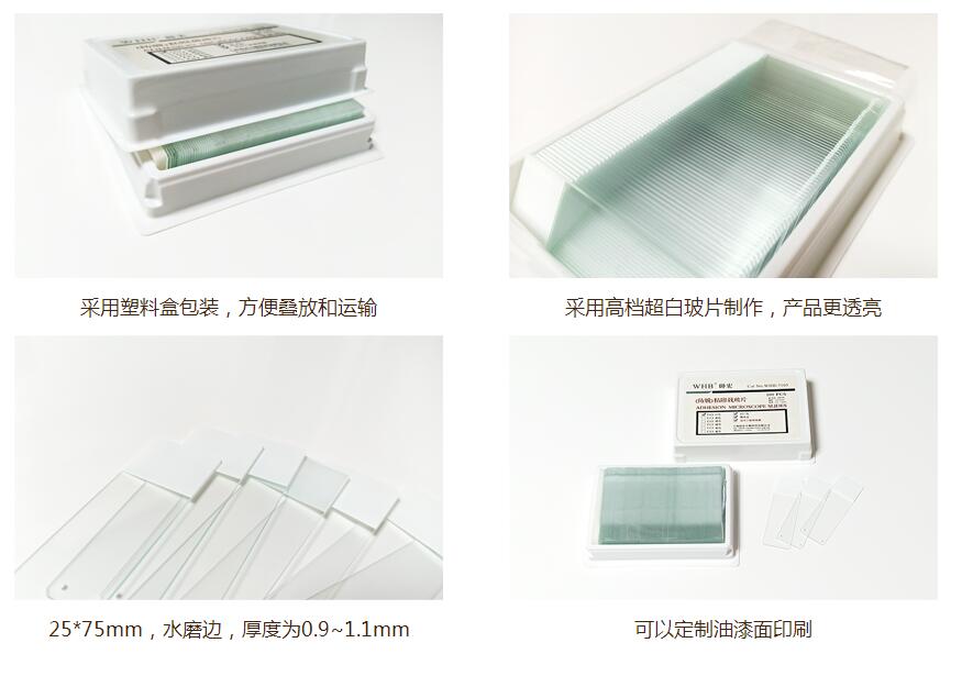 采用高端超白玻片制作,厚度为0.9~1.1mm。已灭菌。 采用先进的玻片表面处理技术(TC处理→超强吸附)可促进细胞在玻片上贴壁生长,细胞贴壁牢固。 细胞捕获玻片使用更广,附着力更强、粘附细胞更多。 载玻片规格:25x75mm,水磨边,有45°角和90°角。 WHB防脱载玻片双面经过TC处理,表面带正电荷,双面均可使用,避免了实验误差。 单头书写区域:磨砂面和彩色油漆面。