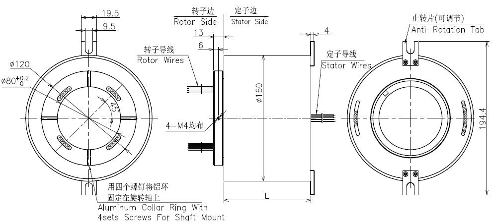 过孔式滑环又称空心轴滑环、中空导电环,是中心带孔的一系列导电滑环的统称,方便液压通道、气压通道或传动轴的安装。偲诺过孔式滑环的通孔直径从3mm到5000mm可选,电流2A到1000A可选,同时可以兼容诸如以太网、USB、HDMI、SDI、Canbus、profibus、power等多种信号,满足多功能系统的需求,并且在高低温、防震、防腐、防水等应用要求上积累了丰富的设计生产经验,能全面满足客户不同传动方案。 优势: · 采用先进的纤维刷多点接触,摩擦低,寿命长 · 传输数字和模拟信号,与数据总线协议兼容 · 通孔直径:3mm-1000mm可选 · 电流:1-10000A可选 · 通路数:1路-300路可选 · 防护等级:IP51-IP68可选 · 工作温度:-55~+250℃可选 · 支持集成多种信号如:以太网、USB、HDMI、SDI、Canbus、profibus、audio. ECN080典型应用: ◆工业机械-加工中心,旋转工作台 ◆机器人,雷达等 ◆起重设备塔楼,卷线轮,测试设备 ◆制造和控制设备 ◆包装机械,货盘机,数控机床等 ◆展览/显示设备 ◆磁性传动器,处理程序控制设备 ◆医疗设备 ◆转台式传感器,应急照明灯 可选项: ◆工作速度 ◆电流,电压 ◆更多通路数 ◆连接端子 ◆防护等级 ◆出线方向 ◆信号及电源可单独或混合传输