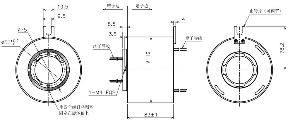 偲诺热电偶滑环有装配简单、更换方便、测温范围广(-270℃~2800℃)、测量精度高、热电偶类型可选等多项特点,其显著优势则为使用寿命长,不受环境温度变化影响。通常,有需要使用热电偶滑环的用户,最关注的是测温的准确性,而偲诺成熟的设计方案让用户体验到产品的高精确测量度,实现了特定条件下温度测量的功能。 ECN050-04P-01S 热电偶滑环 这是热电偶信号滑环,通孔尺寸为50 mm,可传输20A电流和一组K型热电偶信号,工作速度为300rpm,内部接触材料为贵 金属,外壳材料为铝合金,它具有装配简单,易于更换,温度测量范围从-270℃到+ 2800℃的特点,测量精度高,并且热电偶类 型是可选的。 产品特征:• 摩擦小,寿命高,扭矩小,旋转平稳 • 多种热电偶信号 • 传输数据和模拟信号,与数据总线协议兼容