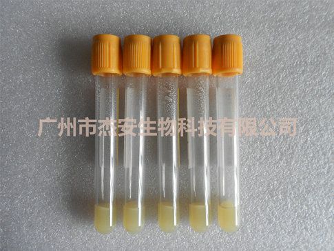 杰安生物是国内专业研发及生产血清分离胶的生产企业,最新研发可媲美美国体系淡黄色的血清分离胶,美国体系淡黄色血清分离胶具有以下特点: 1.血清样本表面无油珠,无析出物,长期使用不会堵塞吸样针。 2.分离胶加胶完成,静止72小时无蹿胶现象。 3.惰性好,最大程度减小对检测结果的干扰。 4.性能稳定。老化和实时实验均应表明,2年内存放稳定,不会影响分离效果。 5.优良的耐辐照灭菌性。可以耐受25kGy的辐照灭菌。 6.分离效果好,离心力适中,易于离心。最小离心力不大于1300g,离心时间只需要5分钟,无需二次离心。 7.运输储存过程中低于55℃时不会发生倒流。 8.高性价比。媲美美国体系品牌BD分离胶,离心力更低。
