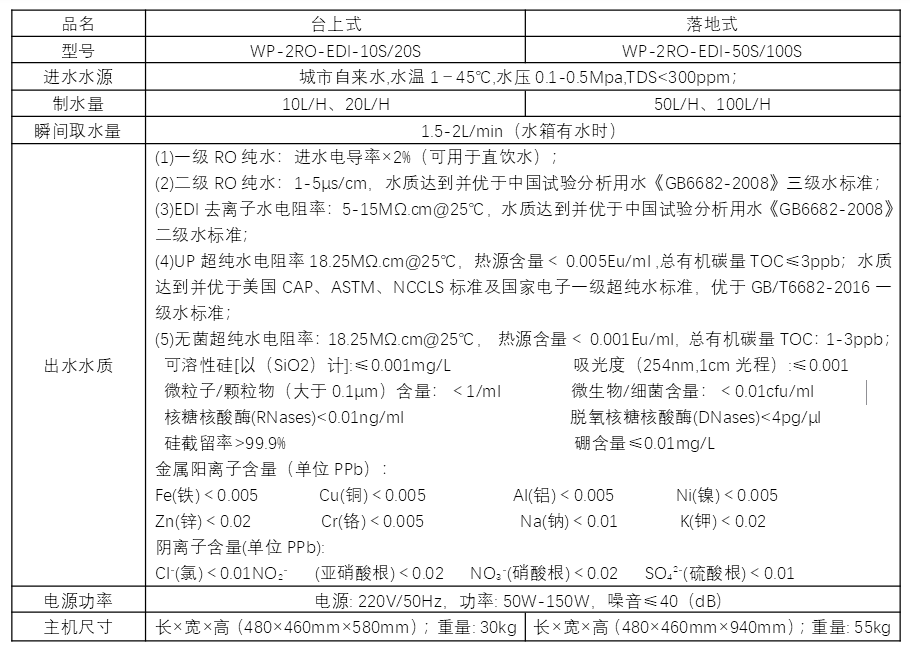 适用范围 HPLC、GC-MS、ICP-AES、ICP-MS、AAS、GF-AAS、TOC分析、IC、电化学、超痕量和痕量无机、有机物分析、分子生物、微生物学、PCR应用及分析、DNA序列分析、哺乳动物细胞培养、细胞和培养介质制备、单克隆抗体生产、电泳、凝胶分析。 功能特点 1.微电脑全自动控制设计,LCD大屏幕中文彩色液晶屏显示,菜单式运行模式,设备运行状态一目了然,人机对话功能完备; 2.电容式钢化玻璃触摸屏按键设计,高灵敏度,经久耐用,无按键损坏的忧虑,彰显美观与大气; 3.设备同时产出5种不同水质:分别为一级RO纯水、二级RO纯水、EDI去离子纯水、UP超纯水、无菌超纯水; 4.系统采用双级反渗透工艺设计,确保在不同源水情况下产水水质的稳定 5.系统配备EDI电除盐膜堆,无需人工再生,化学自动连续再生即可获得5-15MΩ.cm@25℃之间的Ⅱ级纯水,使水质更稳定,延长纯化柱使用寿命,降低设备运行成本; 6.系统具备开机自检、开机自动冲洗、缺水停机保护、停电自动复位、满水自动停机、超低压保护等功能; 7.系统具备超纯水取水不达标循环功能,保持系统的低细菌污染要求,循环功能可以自由开启和关闭,循环上限值可以自由设定,保持系统低细菌污染水平; 8.系统具备UP超纯水超标排放设定功能、耗材寿命终结真人语音报警及更换提示功能(耗材失效上限值可根据客户要求设定)、故障自动检测,提供安全保障; 9.系统具备在线监测源水/RO水、RO水/EDI纯水、UP超纯水(电阻率仪电阻池常数0.01cm-1,温度灵敏度±0.1℃,温度自动补偿)、总有机碳量(TOC)在线检测显示功能; 10.采用内置20/30英寸大容量一体式双通道注塑型预处理+一体式双通道纯化柱系统(管路及接头均获NSF认证),使用寿命更长; 11.独特的RO膜组件设计,采用美国陶氏DOW原装进口RO膜片,保证RO膜的使用寿命及产水水质的稳定; 12.预处理、RO膜、EDI模块、超纯化柱组件均采用快装插拔式模块化独立结构设计,使得系统维护、耗材更换更快捷方便,符合GLP规范; 13.系统具备0-9999ml定时定量取水功能; 14.系统配备原水减压系统,杜绝了原水压力过高而引发漏水的事故; 15.配备漏水检测报警保护装置,有效的防止因设备漏水导致的事故,更好地保护实验室的安全; 16.系统配置UV双波长185nm和254nm的紫外消解系统(进口灯管),有效杀菌,降低TOC,增强系统适用范围; 17.系统配置0.22μm进口PE聚醚砜复合滤膜终端除菌过滤器,保证水质; 18.系统配置移动取水手臂,使远距离取水成为现实,取水手臂采用人体工程学设计,可自由升降,满足不同需求; 19.系统配置30升锥形纯水箱,自带空气呼吸过滤器,方便取用,减少污染; 20.系统具备历史数据储存查询功能,能有效准确地记录并查询历次取水时间(年/月/日/时/分)、取水量(ml) 及取水水质等历史数据; 21.系统具备定时开/关机功能,用户可任意设定开机或关机时间,同时具有当前日期显示与时钟显示及设定功能 ; 22.系统具备二级PIN密码保护,可设置开机密码及用户操作密码,设备管理权和使用权分开,防止无关人员操作; 23.系统设备采用10级过滤工艺:分别为PP过滤+AC过滤+PPF过滤+一级RO反渗透过滤+二级RO反渗透过滤+EDI电除盐过滤+抛光超纯化柱过滤+核子级超纯化柱过滤+UV紫外灭菌过滤+UF终端精密过滤工艺。 技术参数