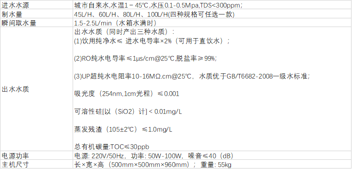 适用范围 适用于高校实验集中供水、中心化验室集中用水、微生物检验、化学分析、血液检测、毒性检测、环境分析、气相色谱、原子吸收、液相色谱等。 产品特点 1.微电脑全自动控制设计,LCD大屏幕中文彩色液晶屏显示,菜单式运行模式,设备运行状态一目了然,人机对话功能完备; 2.电容式钢化玻璃触摸屏按键设计,高灵敏度,经久耐用,无按键损坏的忧虑,彰显美观与大气; 3.系统配备原水减压系统,杜绝了原水压力过高而引发漏水的事故; 4..配备漏水检测报警保护装置,有效的防止因设备漏水导致的事故,更好地保护实验室的安全; 5.系统同时产出三种水质,分别为饮用纯净水,RO纯水和UP超纯水; 6.系统具备开机自检、开机自动冲洗、缺水停机保护、停电自动复位、满水自动停机、超低压保护等功能; 7.系统具备UP超纯水电阻率(电阻率仪电阻池常数0.01cm-1,温度灵敏度±0.1℃,温度自动补偿)、总有机碳量(TOC)在线检测显示功能; 8.系统具备超纯水取水不达标循环功能,保持系统的低细菌污染要求,循环功能可以自由开启和关闭,循环上限值可以自由设定; 9.系统具备UP超纯水超标排放设定功能、耗材失效真人语音报警及更换提示功能(耗材失效上限值可根据客户要求设定)、故障自动检测,提供安全保障; 10.系统配备42L大容量真空压力储水桶,避免了与空气接触的二次污染(可根据客户要求配备大容量开放式水箱); 11.采用内置30英寸大容量一体式双通道注塑型预处理+双通道纯化柱系统,使用寿命更长(管路及接头均获NSF认证); 12.独特的RO膜组件设计,采用美国陶氏DOW原装进口RO膜片,保证RO膜的使用寿命及产水水质的稳定; 13.预处理、RO膜、超纯化柱组件均采用快装插拔式模块化独立结构设计,使得系统维护、耗材更换更快捷方便,符合GLP规范; 14.系统具备0-9999ml定时定量取水功能; 15.系统配备反渗透压力监测表,可随时通过压力判断反渗透膜的运行压力及污堵程度; 16.系统具备历史数据储存查询功能,能有效准确地记录并查询历次取水时间(年/月/日/时/分)、取水量(ml) 及取水水质等历史数据; 17.系统具备定时开/关机功能,用户可任意设定开机或关机时间,同时具有当前日期显示与时钟显示及设定功能; 18.系统具备二级PIN密码保护,可设置开机密码及用户操作密码,设备管理权和使用权分开,防止无关人员操作。 技术参数