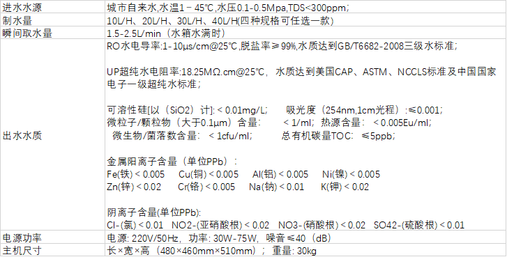 适用范围 适用于标准实验、痕量分析、原子吸收、荧光分析、生化分析、环境分析、血清检查、HPLC、TOC、PCR、AAS、ICP、气相色谱、氨基酸分析等。 产品特点 1.微电脑全自动控制设计,LCD大屏幕中文彩色液晶屏显示,设备运行状态一目了然,人机对话功能完备; 2.电容式钢化玻璃触摸屏按键设计,高灵敏度,经久耐用,无按键损坏的忧虑,彰显美观与大气; 3.系统具备两个取水口,一机两用,可同时产出RO纯水和UP超纯水; 4.系统具备开机自检、自动循环冲洗排放、缺水报警、停电自动复位、满水自动停机、超低压保护等功能; 5.系统具备UP超纯水超标排放设定功能、耗材失效语音报警及更换提示功能、故障自动检测,提供安全保障; 6.系统具备UP超纯水电阻率(电阻率仪电阻池常数0.01cm-1,温度灵敏度±0.1℃,温度自动补偿)、总有机碳量(TOC)在线检测显示功能; 7.配置20L真空压力储水桶(通过NSF认证),避免了与空气接触的二次污染; 8.配备漏水检测报警保护装置,有效的防止因设备漏水导致的事故,更好地保护实验室的安全; 9. 采用内置15英寸大容量一体式双通道注塑型预处理+双通道纯化柱系统(管路及接头均获NSF认证),使用寿命更长; 10.独特的RO膜组件设计,采用美国陶氏DOW原装进口RO膜片,保证RO膜的使用寿命及产水水质的稳定; 11.预处理、RO膜、超纯化柱组件均采用快装插拔式模块化独立结构设计,使得系统维护、耗材更换更快捷方便,符合GLP规范; 12.统具备0-9999ml定时定量取水功能; 13.内置原水减压系统,杜绝了原水压力过高而引发漏水的事故; 14.系统具备操作适时真人语音播报功能,更能体现机器的人性化设计; 15.系统具备历史数据储存查询功能,能有效准确地记录并查询历次取水时间(年/月/日/时/分)、取水量(ml) 及取水水质等历史数据; 16.系统具备定时开/关机功能,用户可任意设定开机或关机时间,同时具有当前日期显示与时钟显示及设定功能; 17.系统具备二级PIN密码保护,可设置开机密码及用户操作密码,设备管理权和使用权分开,防止无关人员操作。 技术参数