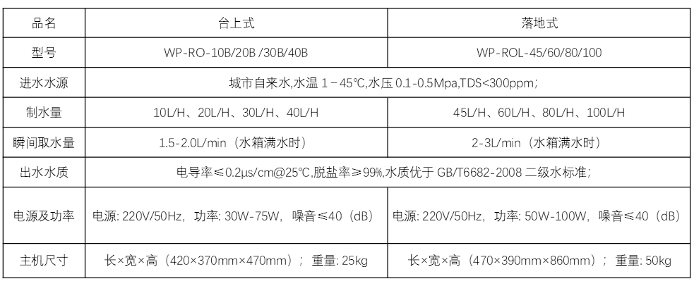 适用范围 适用于普通实验、配制常备溶液、基础实验、微生物检验、常规化学分析、进口超纯水机前置配套、盐雾箱配套用水等。 产品特点 1.采用微电脑程序控制,一键式按键操作设计,简单、快捷、方便; 2.系统具备开机自检、缺水停机保护、停电自动复位、满水自动停机、超低压保护、开机自动冲洗等功能; 3. LCD背光液晶电导率仪(带温度补偿功能)随时在线检测并准确直观地显示出水水质; 4.采用可调压RO静音增压泵(提供CE认证),可连续运转10000小时以上; 5.采用内置15/30英寸大容量一体式双通道注塑型预处理+一体式双通道纯化柱系统(管路及接头均获NSF认证),使用寿命更长; 6.独特的RO膜组件设计,采用美国陶氏DOW原装进口RO膜片,保证RO膜的使用寿命及产水水质的稳定; 7.预处理、RO、超纯化组件均采用模块式独立结构,系统维护、滤芯更换更快捷方便,符合GLP规范; 8.配置真空压力储水桶(通过NSF认证),避免了与空气接触的二次污染; 9.内置原水减压系统,杜绝了原水压力过高而引发漏水的事故; 10.配备漏水检测报警保护装置,有效的防止因设备漏水导致的事故,更好地保护实验室的安全。 11.落地式机型配备反渗透压力监测表,可随时通过压力判断反渗透膜的运行压力及污堵程度 。 技术参数