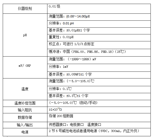 ■产品优势 防腐 防水 该仪器操作简单 程序化设计 防腐、防水,能适应恶劣测量环境,便携式仪器,交直流两用电源模式,便于携带野外测量 产品质量可靠 仪器关键部件采用进口元件,采用一体化设计,无运动部件可靠性能高 ■应用领域 环保、农产品、疾控、污水处理、大学及科研 ■三大增值服务 凡使用方舟产品,若有质量问题,主机三年免费保修,半年 凡使用方舟产品,若有质量问题,主机半年包换 凡使用方舟产品,若有应用问题,免费提供解决方案 ■产品特点 液晶显示,触摸按键 微处理器控制,程序化设计 人体工程学设计,野外使用方便快捷 交直流两用电源模式 能测量溶液的pH、mV、ORP、T值 多点自动校正,自动识别缓冲液 断电保护,自动存储仪器校正数据,可存储200组测量数据 自动延时关机,出厂默认设置为10分钟,用户可根据需要任意设定 具有信号平衡功能,改善仪器响应速度,缩短数据稳定时间 ATC自动识别,手动/自动温度补偿 ■技术参数