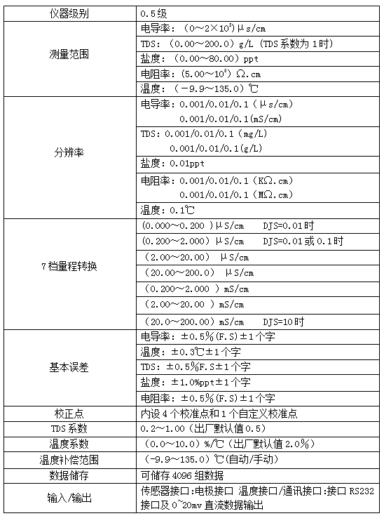 ■产品优势 高精度 多参数系数可调 仪器级别0.5级,参比温度、温度系数、TDS系数、电导池常数均可调 多参数测量模式 一机多用,多参数测量,电导率、电阻率、TDS、盐度、温度值 具有标定功能 一键标定,内置4+1种标准溶液,自动校准电极常数 大容量储存数据 安全可靠 可存储4096组数据,符合GLP数据管理规范;进行存储、查阅、删除及打印,便于数据保存和溯源 产品质量可靠 仪器关键部件采用进口元件,采用一体化设计,无运动部件可靠性能高 ■应用领域 电力、石化、制药、环境监测、疾控、大学及科研等 ■三大增值服务 凡使用方舟产品,若有质量问题,主机三年免费保修,半年 凡使用方舟产品,若有质量问题,主机半年包换 凡使用方舟产品,若有应用问题,免费提供解决方案 ■产品特点 1.大屏LCD显示,背光功能,光线暗时使屏幕更清晰 2.菜单导航,数据、状态、操作提示 3.一机多用,多参数测量,电导率、电阻率、TDS、盐度、温度值 4.参比温度、温度系数、TDS系数、电导池常数均可调 5.一键标定,内置4种标准溶液和1种自定义,自动校准电极常数 6.测量模式:标准溶液测量法和电导常数测量法 7.7档量程自动转换,每档量程带有一个校正点,具有校准功能,自动存储校准数据 8.自动(ATC)、手动(MTC)温度补偿模式 9.时钟和日期双显示,显示当前时间,为数据记录功能提供时间基准 10.可存储4096组数据,符合GLP数据管理规范;进行存储、查阅、删除及打印 11.RS232数据输出接口,可连接电脑 12.可选配系数为0.01、0.1、1、10四种规格的电导电极 13.选配“方舟科技EC-link“软件及数据线,与计算机连机,有效满足GLP要求 ■技术参数