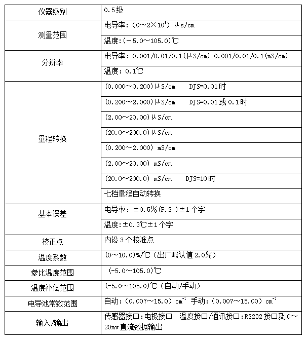 ■产品优势 高精度 温度系数可调 仪器级别0.5级 温度系数(0~10.0)%/℃可调 具有标定功能 一键标定,内置3种标准溶液,自动校准电极常数 防腐 防水 该仪器操作简单 程序化设计 防腐、防水,数码管显示,能适应恶劣测量环境 产品质量可靠 仪器关键部件采用进口元件,采用一体化设计,无运动部件可靠性能高 ■应用领域 电力、石化、制药、环境监测、疾控、食品和药品检测、农产品、饮料、大学及科研 ■三大增值服务 凡使用方舟产品,若有质量问题,主机三年免费保修,半年 凡使用方舟产品,若有质量问题,主机半年包换 凡使用方舟产品,若有应用问题,免费提供解决方案 ■产品特点 微处理器控制,程序化设计,触摸按键 低电压变频设计,高精度A/D转换,一体化设计 断电保护,防腐、防水,能适应恶劣的测量环境 多种测量模式,可测量溶液的电导率、电阻率、TDS、温度值 温度系数可调,ATC自动识别,自动/手动温度补偿 自动存储仪器校准数据,且断电数据保护 一键标定,内置3个校准点,自动校准电极常数 自动存储仪器校正数据,且掉电数据保护 可配系数为0.01、0.1、1、10四种规格的电导电极 可配DJS-0.01的钛合金电导电极及流动测量槽,可以测量纯水及高纯水的电导率 仪器防腐、防水,能适应恶劣测量环境 ■技术参数